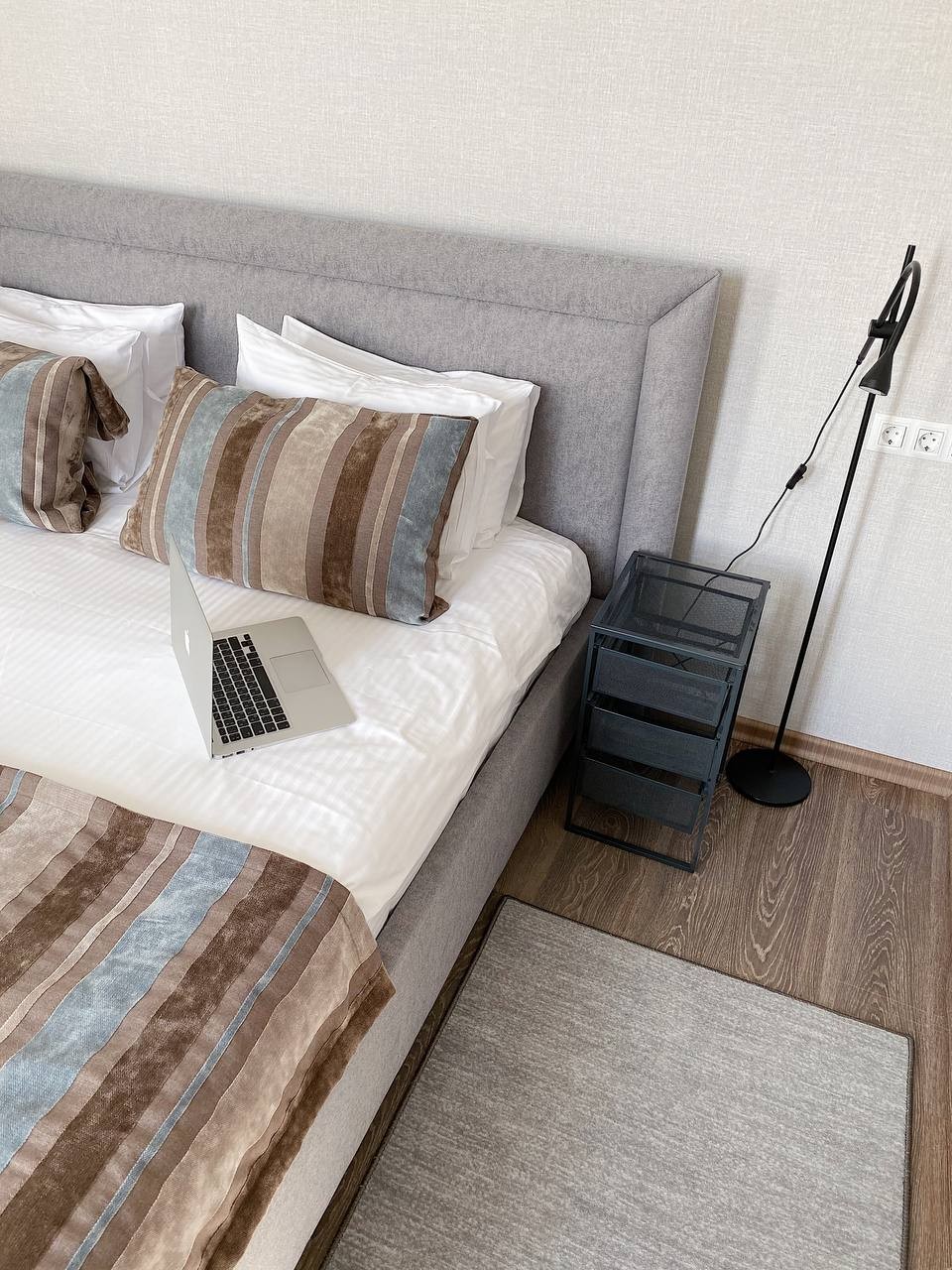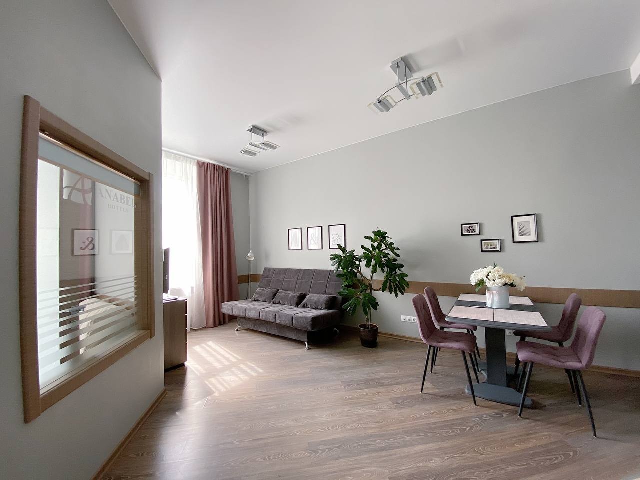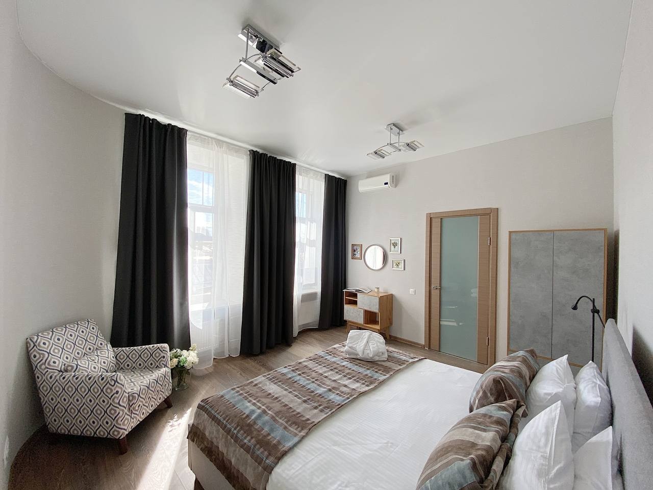 Современные апартаменты с 1 спальней, кабинетом и гостиной открыты в апреле 2021 года. Апартаменты подойдут для размещения 5 гостей: спальня оборудована двуспальной кроватью, в небольшом кабинете есть кресло-кровать, а в гостиной раскладывается двуспальный диван. Апартаменты расположены в одном подъезде с нашими гостевыми комнатами. Здесь часто останавливаются семьи, а также гости, выбирающие варианты размещения повышенной комфортности. В подъезде работает круглосуточная служба охраны.